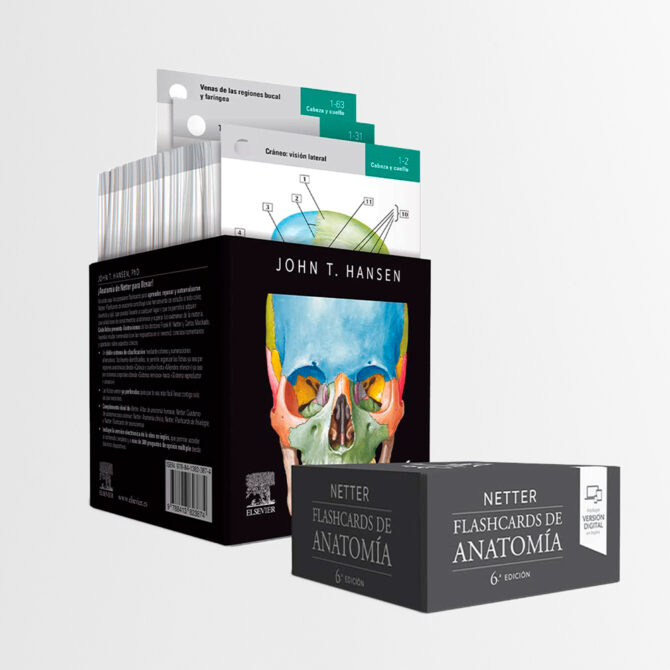 Netter Flashcards de anatomía 6a Edición, nueva edición que se presentan como una valiosa herramienta de aprendizaje ya que proporcionan un método de memorización y autoevaluación vinculados a Netter, Atlas de anatomía humana (tanto en su abordaje por regiones como por sistemas)